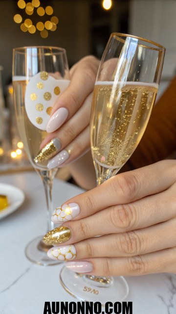 Champagne bubbles for New Year’s eve. You paint gold fizz on nude bases. Glasses clink in designs.
