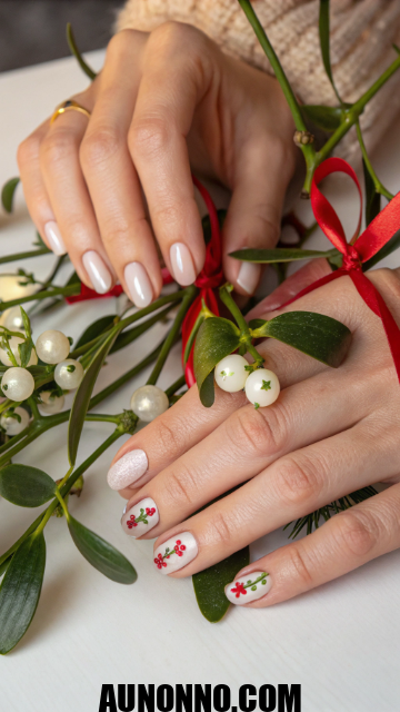 Mistletoe invites kisses on nails. You draw green sprigs with white berries. Red bows tie them.