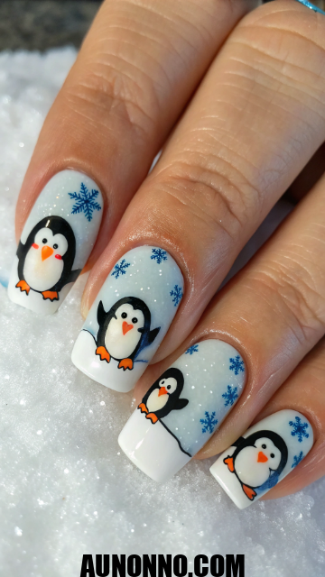 Penguins waddle onto nails adorably. You paint black bodies with white bellies. Orange beaks shine.