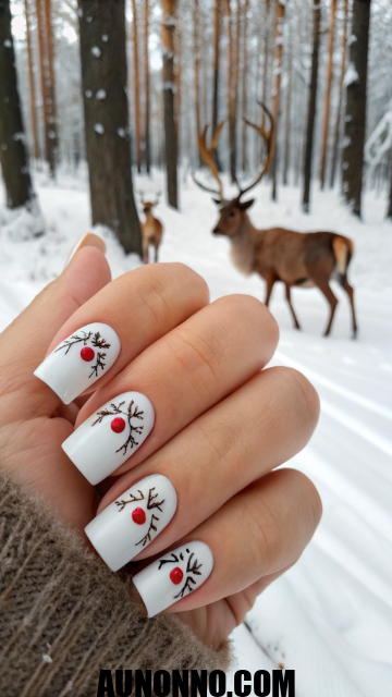 Reindeer inspire cute nail art. You draw brown antlers and red noses. White backgrounds keep it simple.