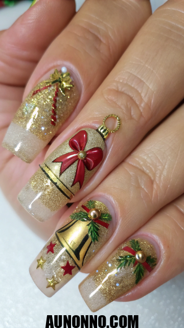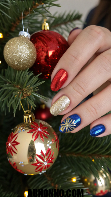 Red and green colors define Christmas traditions. You paint your nails red on some fingers and green on others. Gold accents add a touch of sparkle.