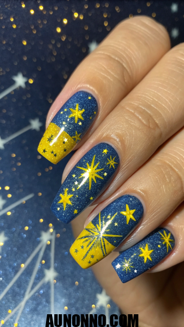 Stars top trees on your nails. You draw yellow stars with rays. Blue skies background them.