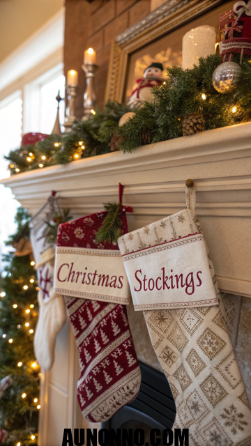 Add small props like candy or pinecones near stockings. Use natural window light or soft lamps for gentle shadows. Take both wide shots showing the full display and close-up detail photos.