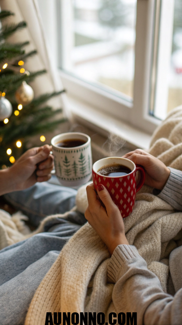 Showcase the cozy start of a Christmas day with coffee mugs, soft blankets, and relaxed smiles. Capture steam rising from hot drinks wrapped in festive mugs. Setting the scene with open presents or a book adds story layers.