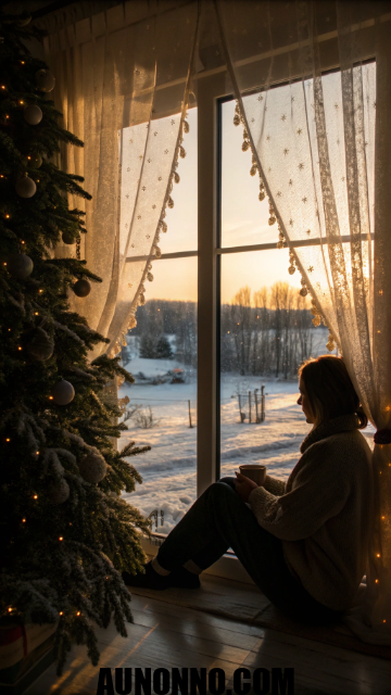 Capture soft natural light filtering through decorated windows. Position your subjects near the glow for a warm and welcoming frame. The contrast between inside coziness and outside winter sets a peaceful tone.