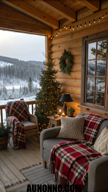 Photograph cozy seating areas near windows with natural light. Plaid blankets and candles complete the look. Logs crackling in the background give extra cosiness.