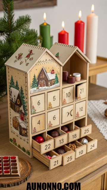 Doors number on a wooden calendar. Each hides a small surprise inside. Candles burn beside it daily.