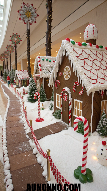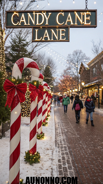Giant candy canes line a festive pathway. Red and white stripes twist up high. Bows tie them at the base neatly.