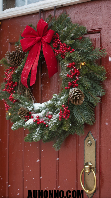 Snow dusts the top lightly. The door knocker shines below. You see tradition in this classic look.