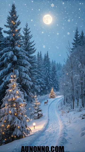 Trees stand tall in a quiet forest covered in fresh snow. Lights twinkle on branches as evening falls. This scene creates a peaceful holiday vibe on your screen.