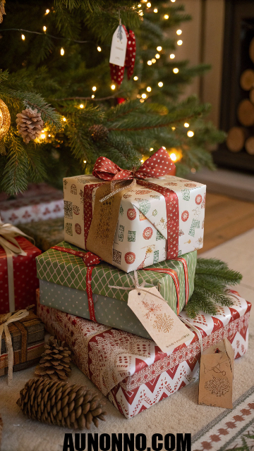 Gifts stack under a lit tree neatly. Bows top each package in colors. Tags name the recipients clearly.