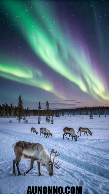 Reindeer graze on snowy fields under northern lights. Antlers curve gracefully on their heads. Aurora dances in green waves above.