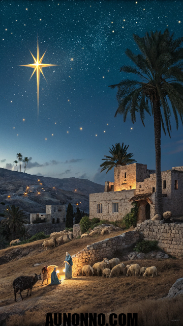 Stars fill the sky over ancient buildings. A bright star leads the way down. Shepherds watch from hills nearby.