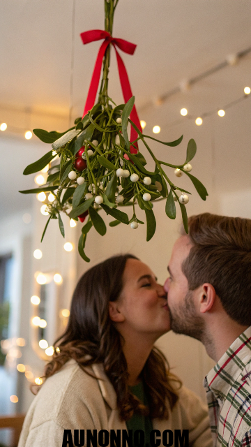 Couples kiss under hanging mistletoe. Berries glow white on green leaves. Ribbons tie the bunch above.