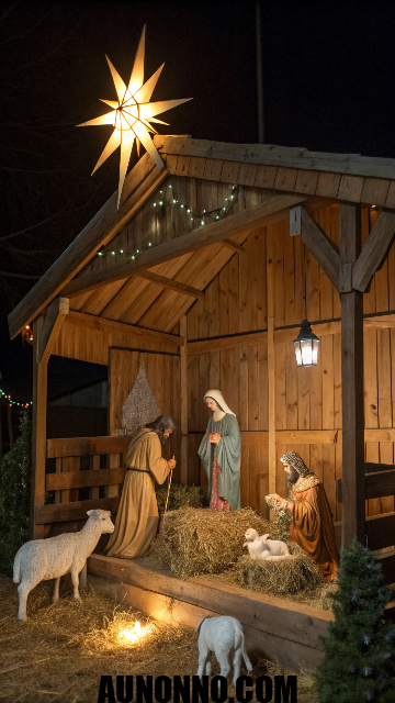 Wise men approach with gifts in hand. Lanterns light the simple wooden structure. You reflect on the meaning behind the holidays.
