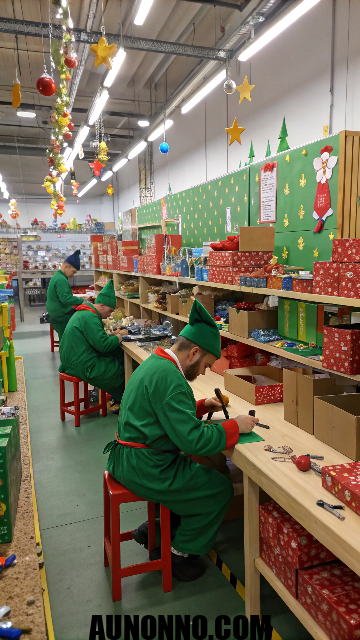 Shelves hold finished gifts stacked high. Laughter fills the room with joy. You peek into Santa’s world.