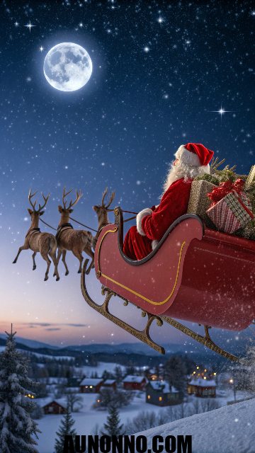 Rudolph leads with his red nose glowing. Villages twinkle far below on the ground. You feel the magic of Santa’s journey.