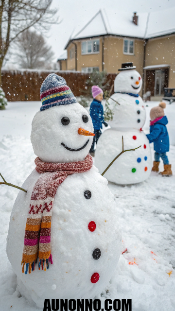 Children build more in the distance. Snow falls around them gently. You enjoy the playful family.