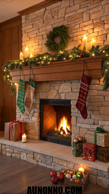A warm fire crackles in a stone fireplace. Stockings hang from the mantel filled with small gifts. Candles flicker nearby adding a soft glow.