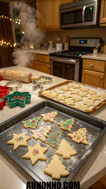 Cookies shape like stars on a tray. Icing pipes in white and green. Sprinkles scatter over the tops.