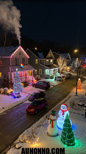 Inflatable figures stand in yards waving hello. Trees glow with wrapped bulbs outside. This display lights up the night cheerfully.