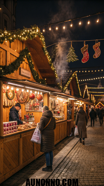 Stalls sell ornaments and treats in a busy market. Vendors smile behind wooden counters. Lights string overhead creating a canopy.