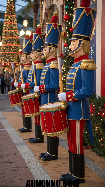 Tall nutcrackers stand guard in a row. Uniforms shine in blue and red. Hats top their heads with feathers.