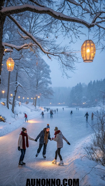 Lanterns hang from poles lighting the way. Couples hold hands while circling. This image captures winter fun perfectly.