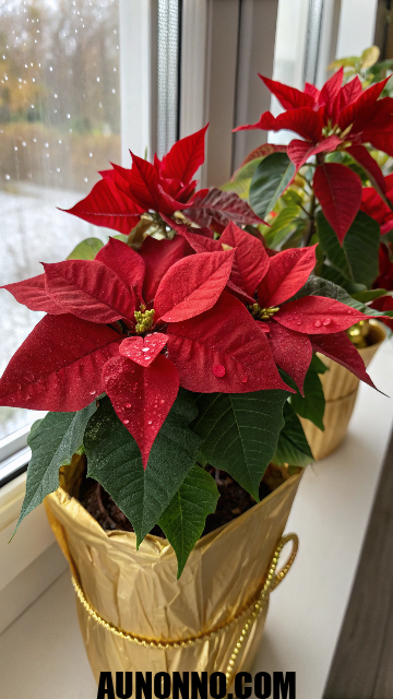 Water drops glisten on petals fresh. Sunlight filters through a window nearby. This plant symbolizes the season.