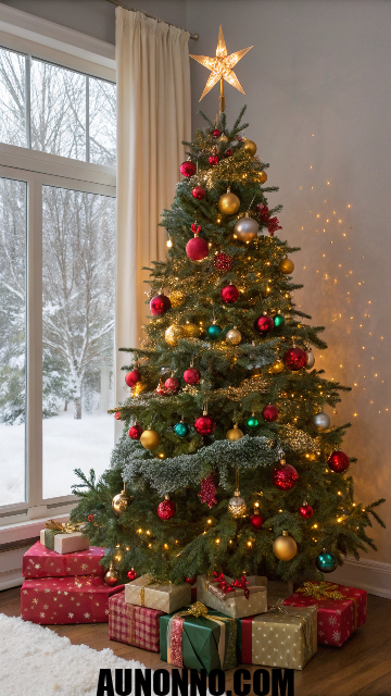 Ribbons curl around some branches for extra flair. The tree stands against a window with snow outside. You see the holiday spirit in every detail.