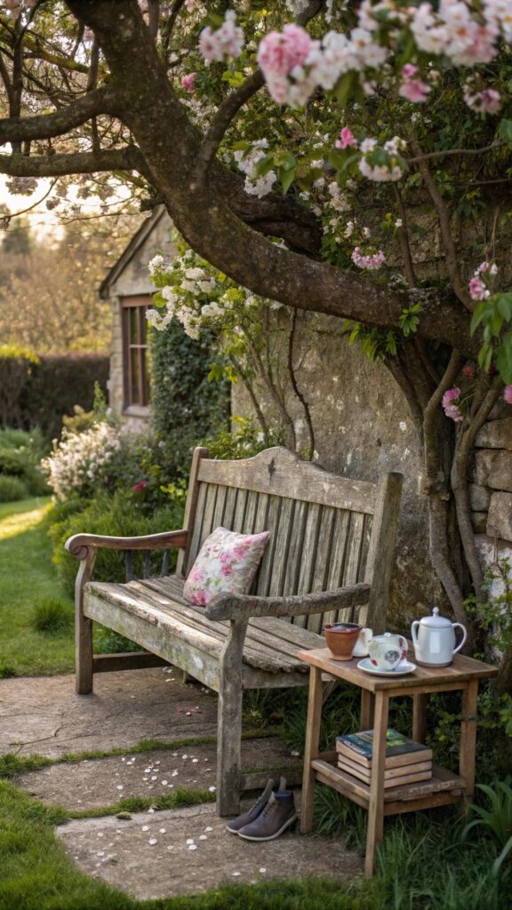A rustic bench adds a cozy seating area to your cottage garden. Use weathered wood or wrought iron for a vintage feel. Place it under a tree or surrounded by flowers.