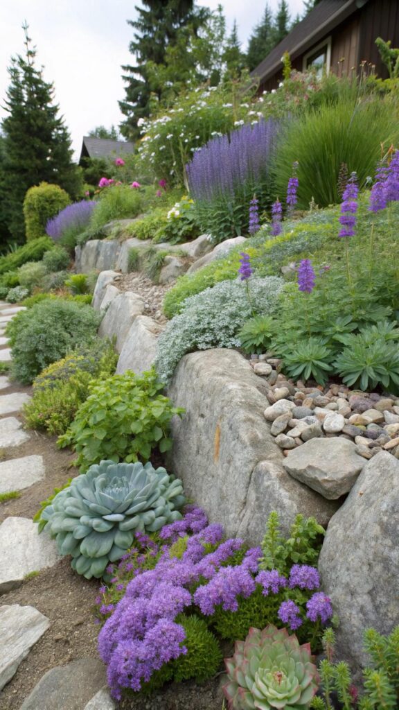 A cottage garden with a stone pathway adds structure and charm. Use irregularly shaped stones to create a natural-looking path. Line the edges with low-growing plants like thyme or sedum.