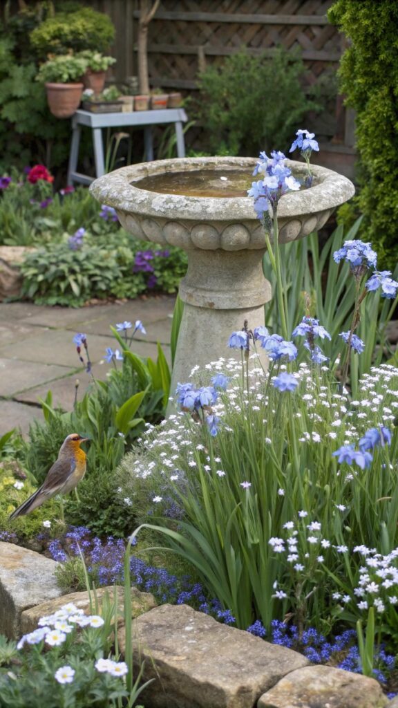 A cottage garden with a water feature adds a soothing element. Install a small pond, fountain, or birdbath to attract wildlife. Surround it with moisture-loving plants like irises and forget-me-nots.