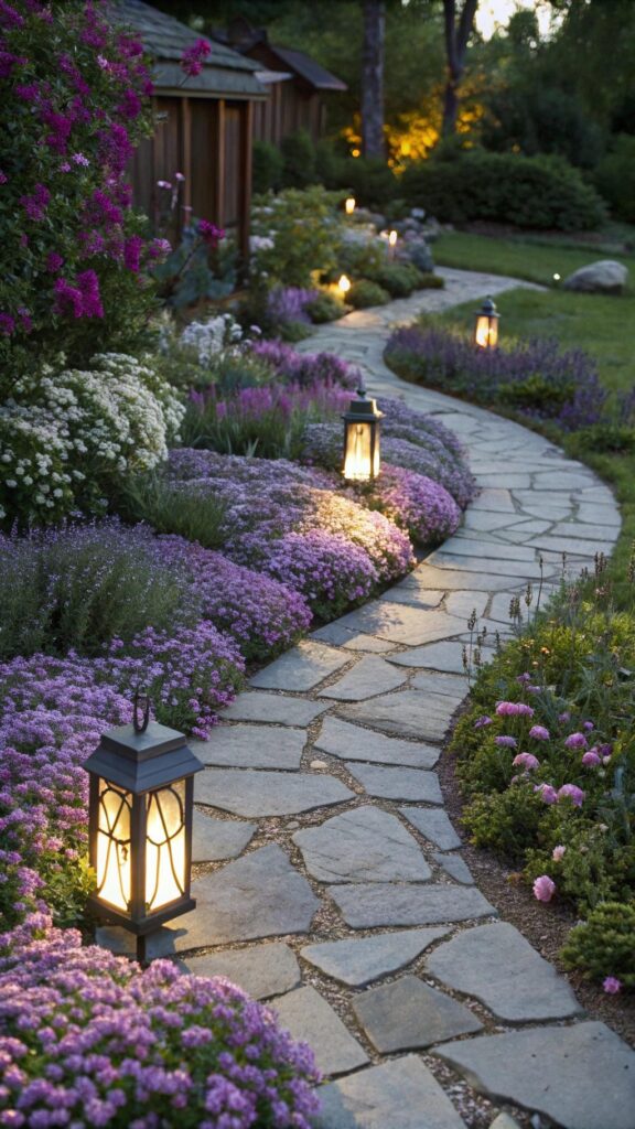 This style is both practical and decorative. The pathway guides visitors through the garden, highlighting different areas. Add solar-powered lanterns for a magical evening glow.