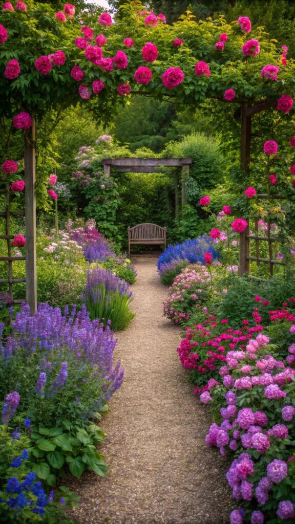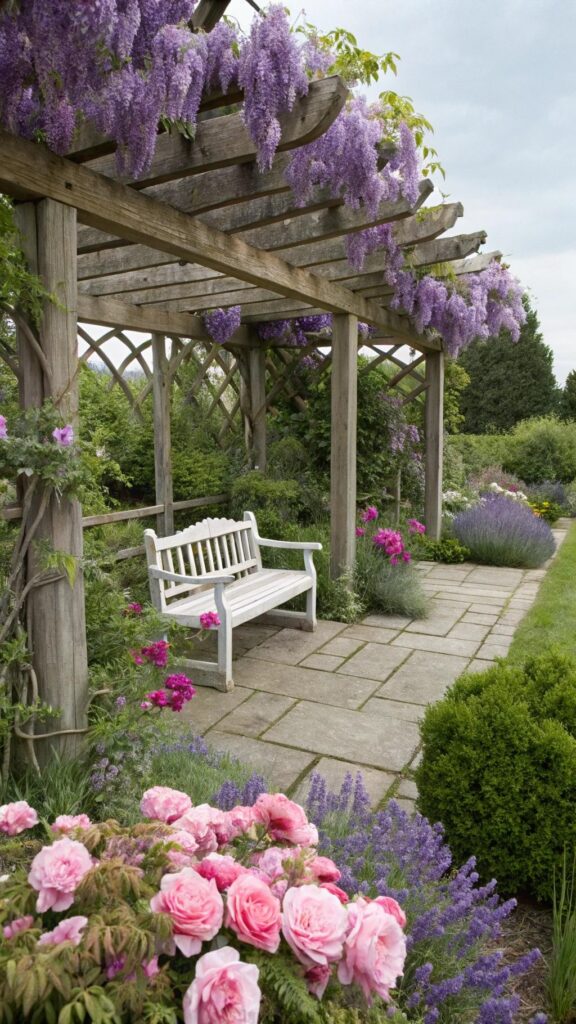 A cottage garden with a pergola adds vertical interest. Train climbing plants like wisteria or honeysuckle to grow over the structure. This creates a shaded retreat perfect for relaxing.