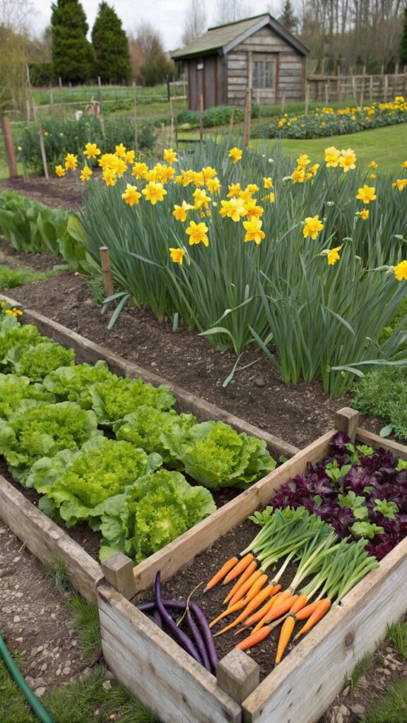 A cottage garden with a vegetable patch combines beauty and practicality. Plant rows of lettuce, carrots, and beans alongside colorful flowers. This creates a productive and visually appealing space.