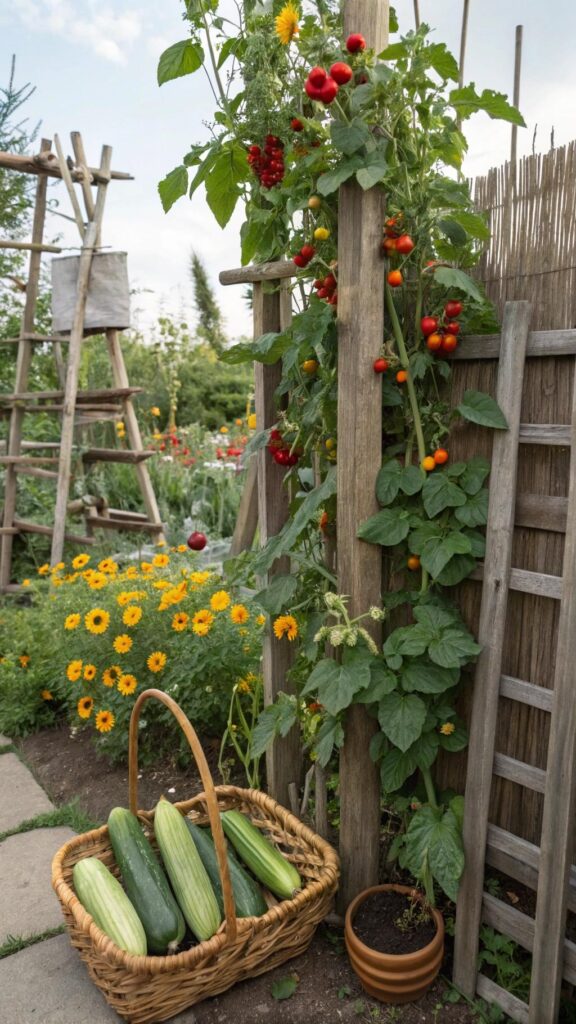 A rustic cottage garden with vegetables blends edibles with ornamentals. Plant tomatoes, zucchini, and peppers alongside sunflowers and cosmos. This creates a productive yet picturesque space.