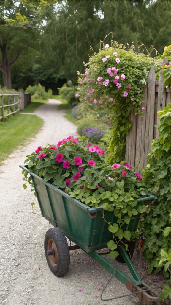 Repurpose a rustic garden cart as a decorative element. Fill it with trailing plants like ivy and petunias. Place it in a corner or along a pathway for a charming touch.