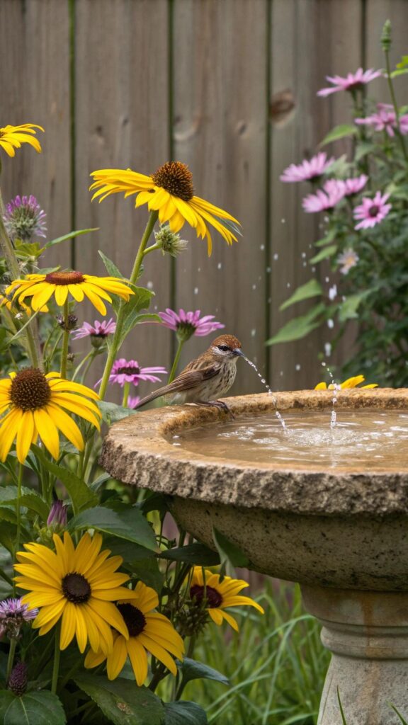 This attracts birds and adds movement to your garden. Pair it with bird-friendly plants like sunflowers and coneflowers. It’s a simple yet delightful addition.
