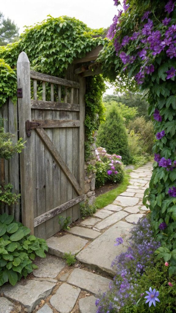 A rustic gate adds charm and character to your cottage garden. Use weathered wood or wrought iron for a vintage look. Add climbing plants like ivy or clematis to grow over it.