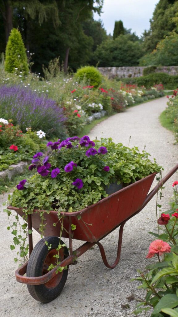 Repurpose a vintage wheelbarrow as a unique planter. Fill it with trailing plants like ivy and petunias. Place it in a corner or along a pathway for a charming touch.