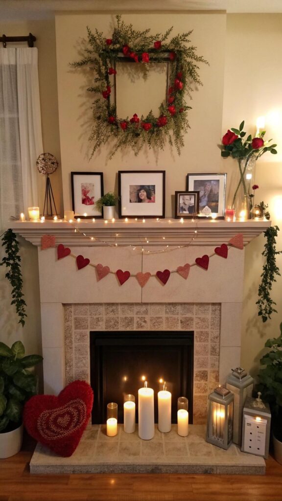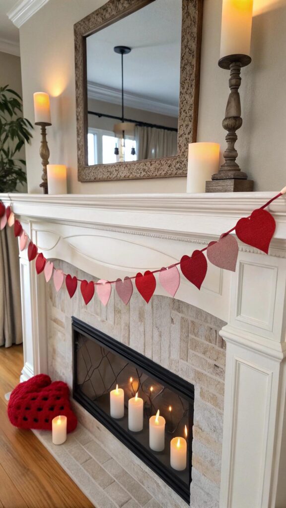 Decorate your mantel with Valentine’s-themed items like candles, garlands, and heart-shaped decorations. This creates a focal point in your living room.