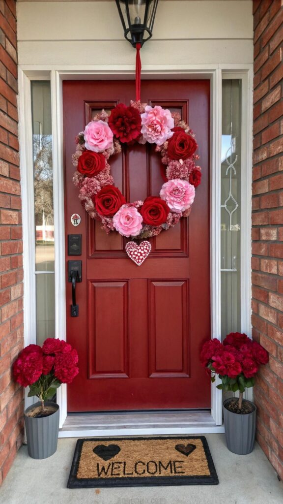 Welcome your guests with a Valentine’s Day wreath on your front door. Use materials like faux flowers, ribbon, and heart-shaped ornaments to create a festive design.