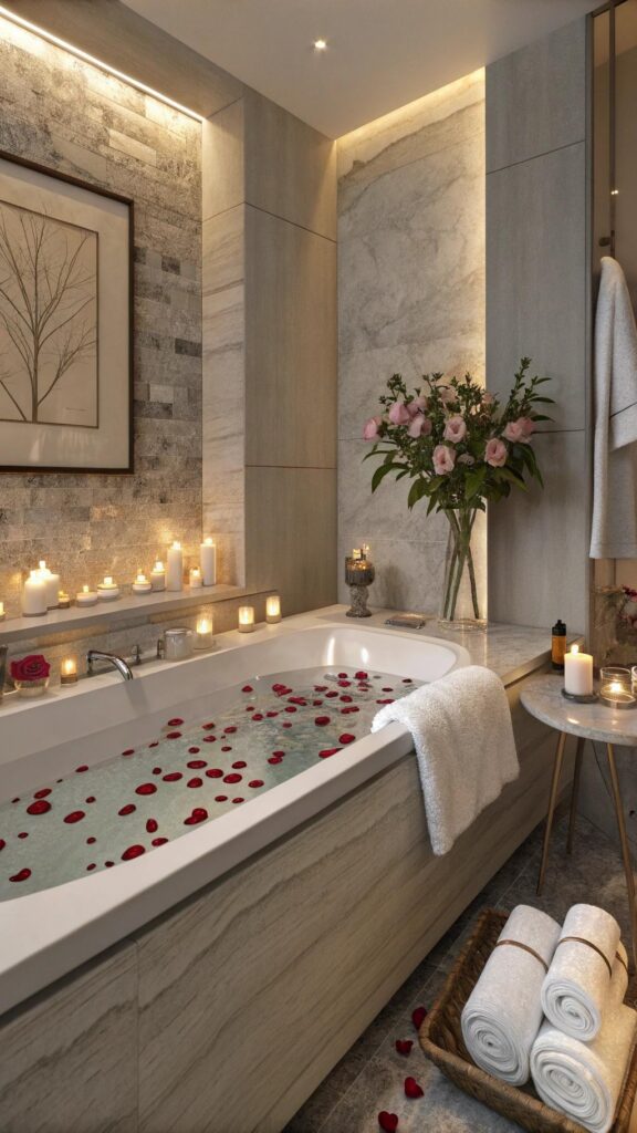 Transform your bathroom into a spa-like retreat for Valentine’s Day. Add candles, rose petals, and luxurious towels to create a relaxing atmosphere.