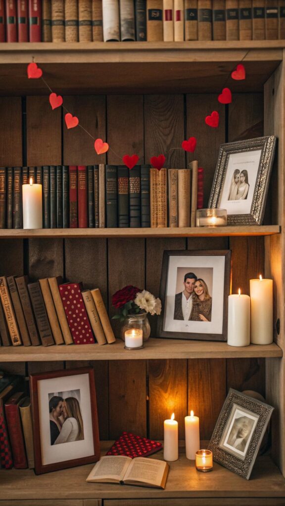 Update your bookshelf with Valentine’s-themed decor. Add small heart-shaped decorations, candles, or books with romantic covers.