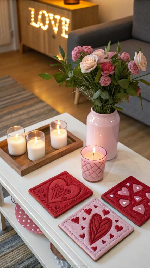 Swap out your everyday coasters for ones with love-themed designs. Look for coasters with phrases like “Love” or “XOXO” in romantic colors.