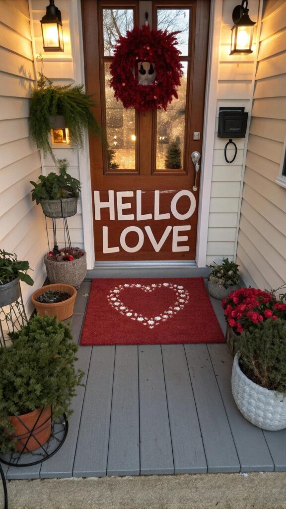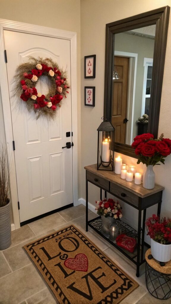 Create a romantic entryway with a love-themed doormat, wreath, and decor. Add a small table with candles or flowers to welcome your guests.