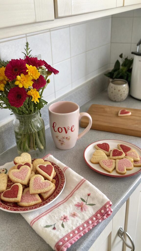 Incorporate Valentine’s-themed decor into your kitchen. Use items like heart-shaped dish towels, cookie cutters, or mugs with romantic phrases.