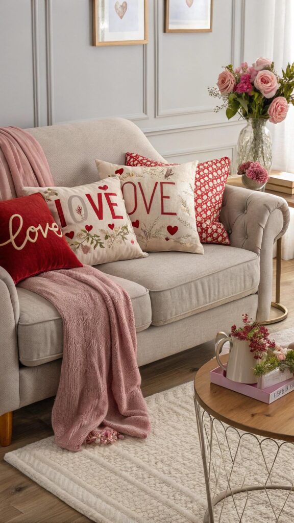 Swap out your everyday throw pillows for ones with love-themed designs. Look for pillows with phrases like “Love You” or “XOXO” in romantic colors like red, pink, or gold.