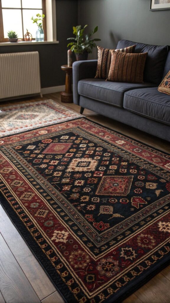 Layering rugs can also create visual interest. For example, placing a smaller, patterned rug on top of a larger, solid dark rug can add depth and dimension to the room.